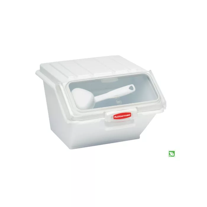 The Rubbermaid Commercial Shelf Ingredient Bin with Scoop offers quick one-handed access while stacked and an integrated measuring tool that increases preparation efficiency, space optimization, and promotes food safety compliance. 40 cup capacity.