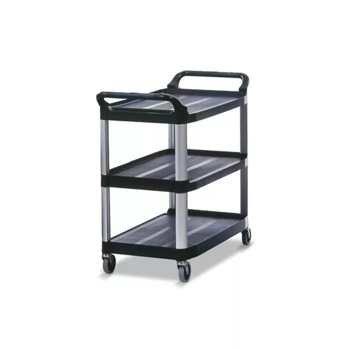Durable and attractive cart function in front and back of house applications. Sized to cart large loads. Large shelves hold various equipment and supplies. 300lb total load capacity, 100lbs/shelf. Holds 6 bus boxes. Dim: 40 5/8” x 20” 37.8”.