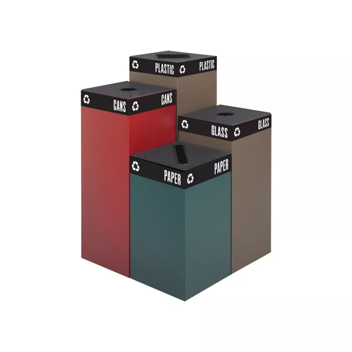 - Aesthetically pleasing containers feature hinged tops specifically designed to handle cans, glass, paper and waste