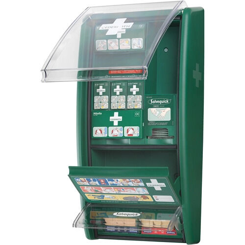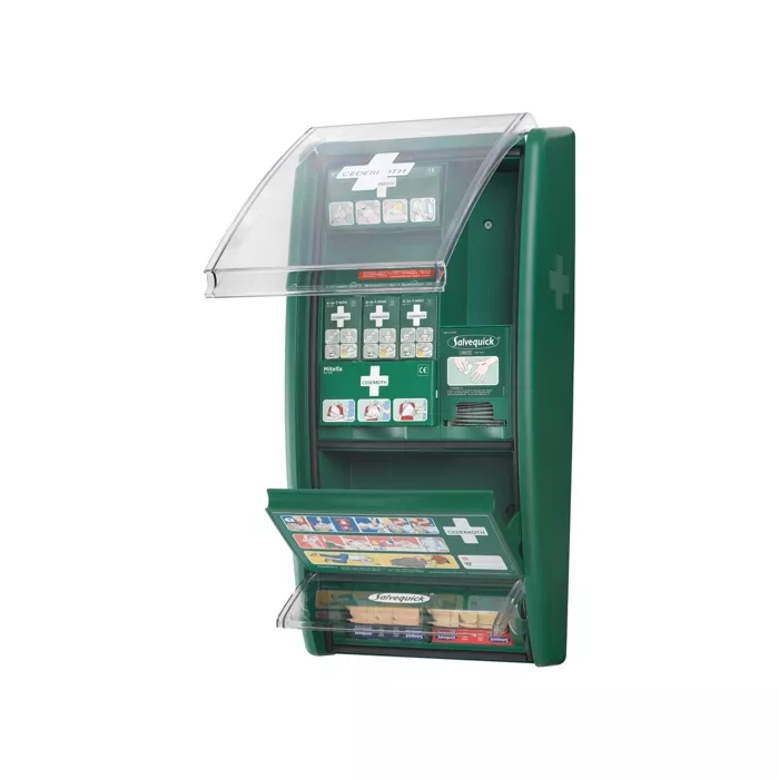 - Includes 4-in-1 blood stoppers, triangular bandage, protection kit, bandage dispenser with 45 bandages, wound cleaners and first aid instructions