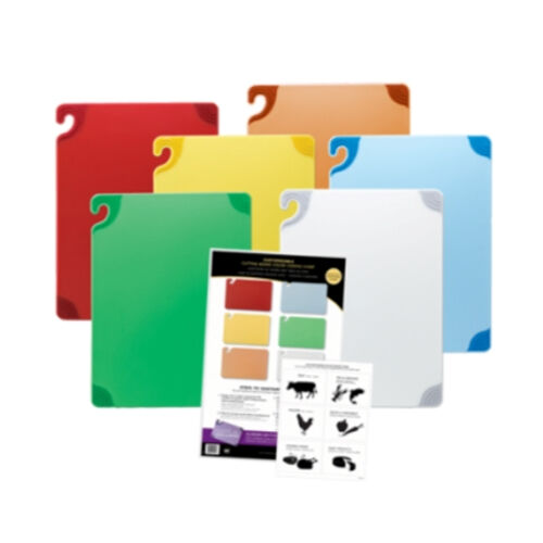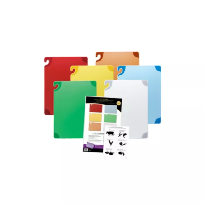 Patented food safety hook allows for sanitary transport and storage. Integrated anti-slip grip corners hold the board securely in place, eliminating the need for the use of an unsanitary “wet towel". System comes with all 6 HACCP colours, designed to meet health codes and minimize cross contamination.