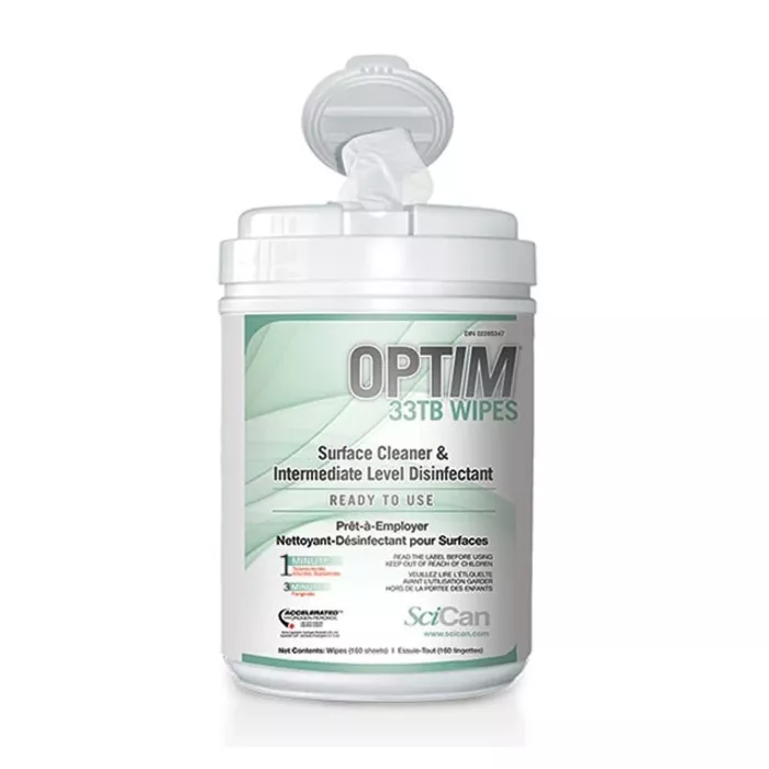 SciCan Optim 33TB Surface Disinfectant Wipes with Aloe Scent are pre-moistened, ready-to-use wipes designed for effective cleaning and disinfection of hard, non-porous surfaces. Each wipe measures 6" x 7" and comes in a convenient tub containing 160 wipes. The pleasant aloe scent ensures a fresh and clean environment. The formulation of these wipes kills a broad spectrum of pathogens, including bacteria, viruses, and fungi, offering a dependable solution for maintaining hygiene in various settings.