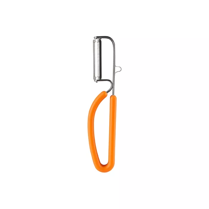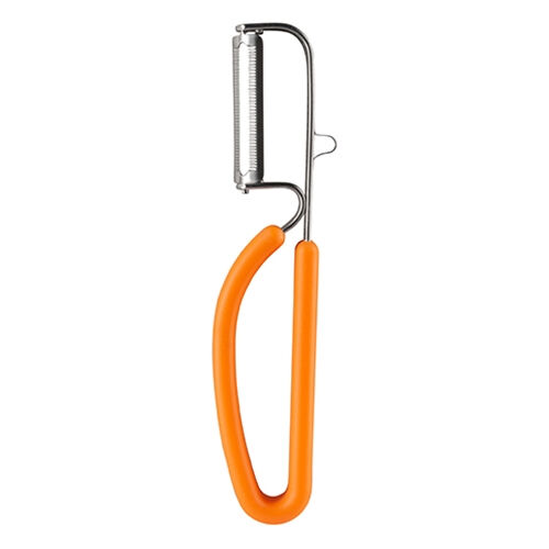 Perfect for fruits and root vegetables like potatoes with it's "eye-remover" for eyes and sprouts, this P-shaped (serrated edge) peeler is designed to be both sturdy in it's stainless steel construction and ergonomic with its handle design. The blade is double-sided which makes faster peeling ambidextrous use, and can be covered with the included blade protector to ensure safety and lasting sharpness.