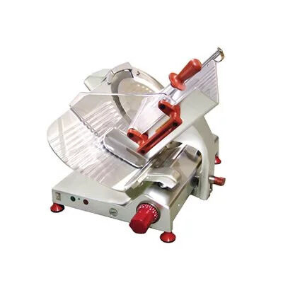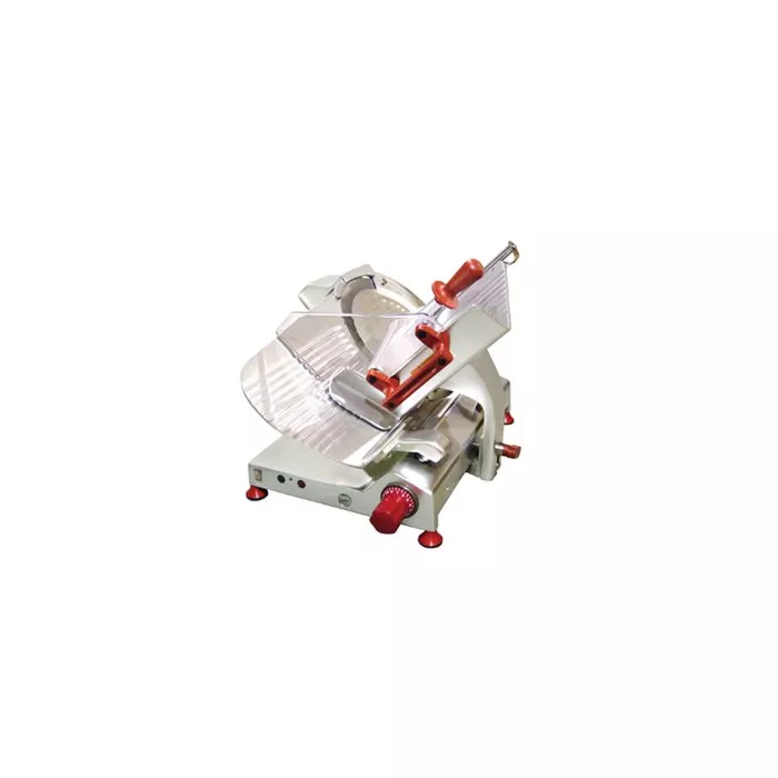 GEAR driven transmission. ON/OFF one switches with LED. Removable parts for cleaning, blade cover, product-holder plate, aluminum meat grip, stainless steel slice deflector. Blade with NARROW BAND of chromium - plated hardened steel. Turning aside and REMOVABLE sharpener. Big size product - holder plate. Transparent Plexiglas Protection at product - holder plate. High reliability of all elements. New design with large spaces. Safety devices according to EN1974 standards.
