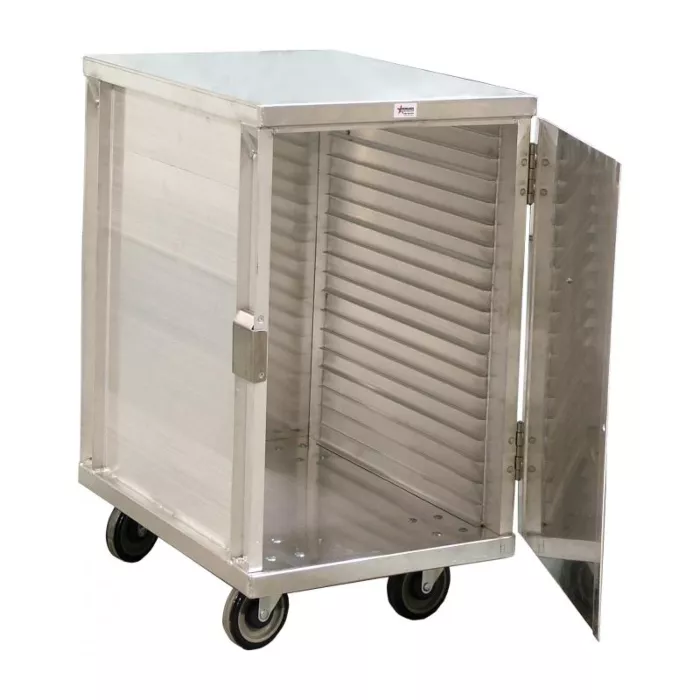 Constructed in aluminum. The door is supported by stainless steel hinges that allow it to open 270 degrees. 5" heavy duty casters allow for easy mobility. The spacing between the slides is 1.5" and all cabinets support standard 18" x 26" pans.