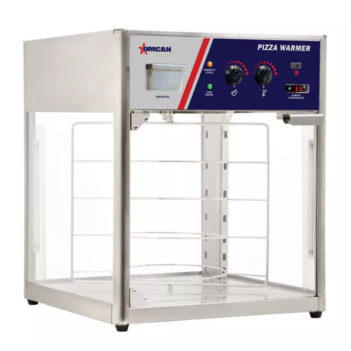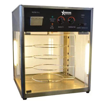 This pizza warmer is designed to merchandise product with even temperature and humidity. Excellent for fast-food restaurants, convenient stores, and supermarkets. Equipped with a revolving display and tempered glass panels to provide easy maintenance and durability.