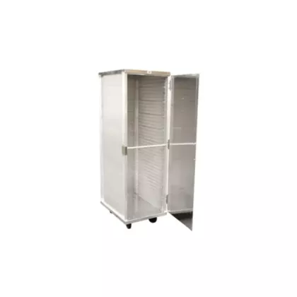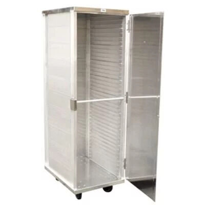 Constructed in aluminum. The door is supported by stainless steel hinges that allow it to open 270 degrees. 5" heavy duty casters allow for easy mobility. The spacing between the slides is 1.5" and all cabinets support standard 18" x 26" pans. Fully assembled.