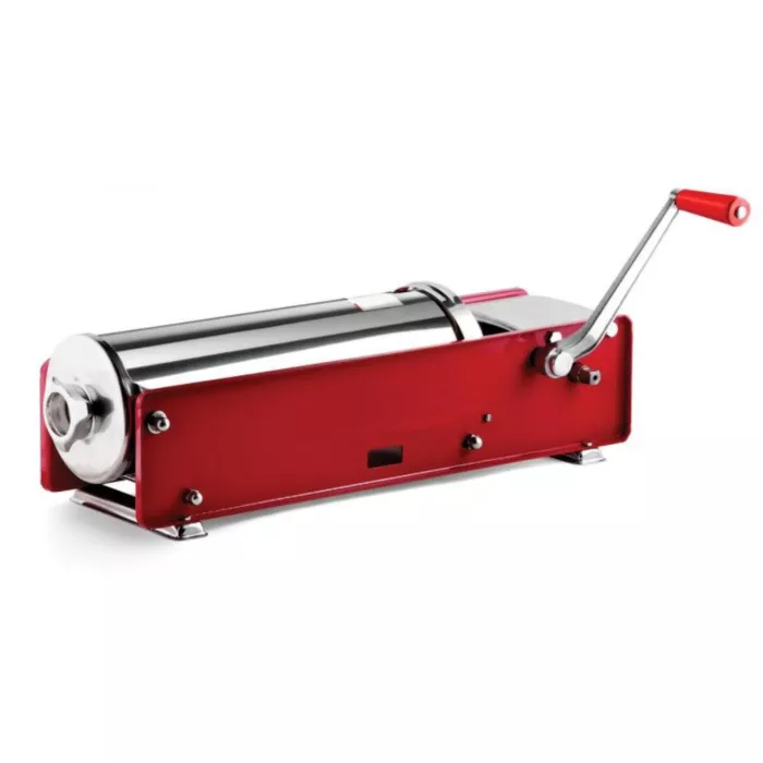 selection of sizes and configurations for residential and commercial applications. It has enameled steel sides. Features a two speed gearing system - one gear for sausage stuffing and one gear to return piston quickly to starting position. Supplied with a selection of stuffing funnels.