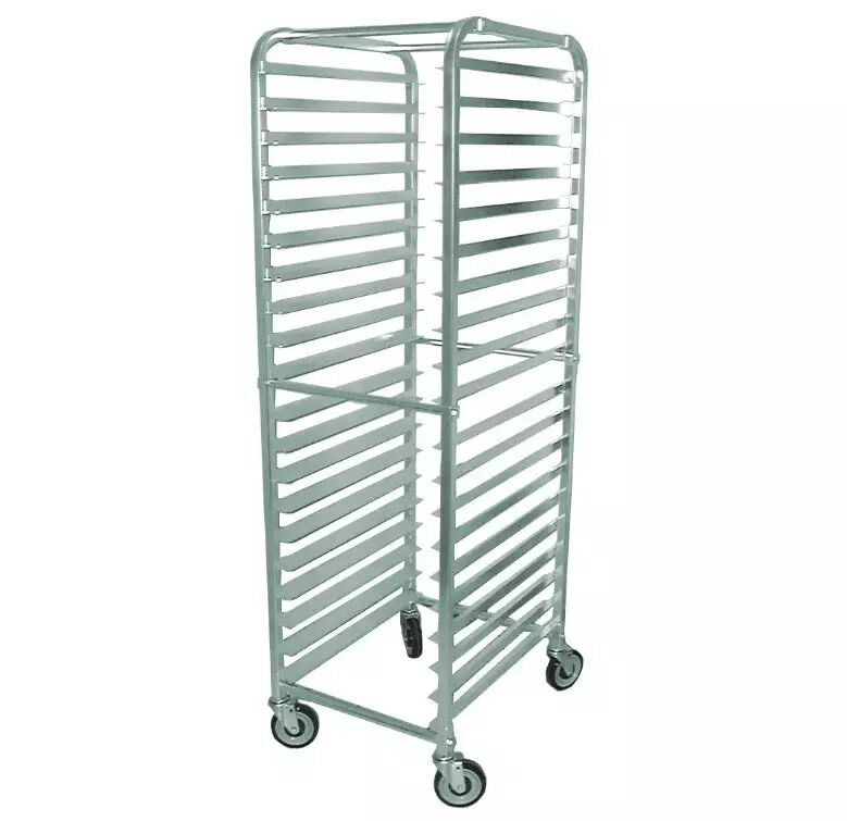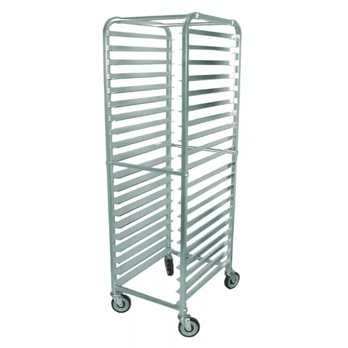 Heavy Duty Knock Down Pan Racks in Stainless Steel or Aluminum, with welded angle slides. Complete with 5" heavy-duty casters. 26” x 20.5” x 69”.