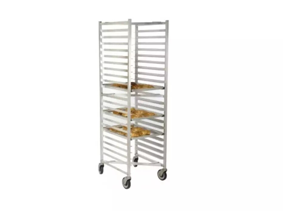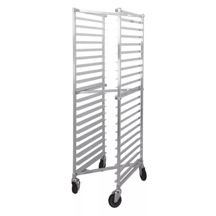 Heavy Duty Knock Down Pan Racks in Stainless Steel or Aluminum, with welded angle slides. Complete with 5" heavy-duty casters.