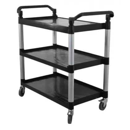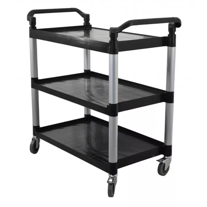 • Durable plastic carts with 3 shelves, 4 swivel casters (two with locks)