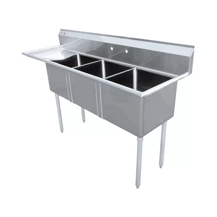 Upgrade your commercial kitchen with the Slice Craft 3 Compartment Stainless Steel Commercial Sink that comes with a left drainboard that spans 18 inches! - a versatile and durable solution that allows you to handle all three essential steps - washing, rinsing, and sanitizing - within the same unit!