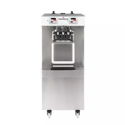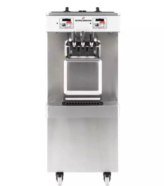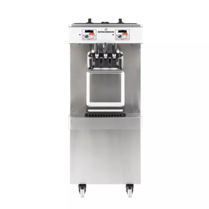 The Spaceman Soft Serve Machine features a digital control system with pre-set programs that let you mix and freeze soft-serve ice cream in three different flavors or one twist. Two 8.5 qt freezer hoppers can hold up to 8 liters (1.75 gal.) of product, while a 1.8 qt freezing cylinder with fast-freeze technology ensures thick and creamy ice cream every time. The convenient Gravity Feed System mixes and freezes two soft-serve ice cream flavors from each hopper into one another without ever having to stop the machine.