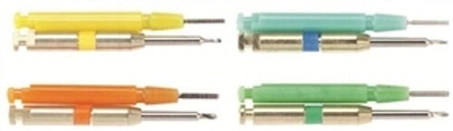 Stabilok Dentine Pins are an effective and economical way to provide extra mechanical retention for restorations in both anterior and posterior teeth. Once in place in the tooth, they can be reduced in length and / or bent into the desired position. A major advantage of Stabilok Dentine Pins is that the pin is securely held in a contra-angle shank until it is ready to automatically shear off in the tooth at the correct depth. Preparation of the tooth: The tooth that requires placement of a Stabilok Dentine Pin should be cleared of all caries and dried with an air syringe. In general, a separate Stabilok Pin will be required for each cusp missing. A pre-operative radiograph may be useful in identifying the position and size of the pulp. Procedure for placing the Stabilok Pin: Place a Stabilok Twist Drill in a contra-angle handpiece and latch it in place. With the motor running at a speed of about 2000 rpm drill a hole in the dentine, taking care not to drill accidentally into the enamel or the pulp. The Stabilok Twist Drill has a self-limiting shoulder which prevents drilling too deeply. Once the pin hole has been drilled, remove the twist drill from the handpiece (the twist drill should be sterilized before it is used again). Place a Stabilok Dentine Pin in the handpiece and latch it in place. With the Pin rotating at about 2000 rpm, present the tip of the pin to the opening of the pre-drilled pin hole. The pin will then self-thread to the bottom of the pre-drilled hole and shear-off at the neck formed in the threaded portion. Modifying the Pin: Stabilok Dentine Pins can be modified by either shortening them or by bending them. SHORTENING: To shorten a pin, proceed as follows: Place a high speed diamond or carbide fissure bur in a turbine handpiece. Position the handpiece such that the bur is perpendicular to the Stabilok Dentine Pin and at a point corresponding to where the pin is to be cut. With the bur running, gently bring the bur into contact with the pin and allow it to cut through the pin from one side to the other. A gentle axial movement of the bur to and fro will facilitate the operation. DO NOT attempt to shorten the pin before it is placed in the tooth because doing so would damage or remove the tapered tip which allows self threading. BENDING: Stabilok Pins can be bent once , after they have been placed in the tooth. An amalgam plugger can be used by applying it to the tip of the pin and gently bending the pin into the position required. The pin should not be bent more than once because repeated bending will weaken the pin and may also weaken it’s retention in the pre-drilled hole. Disinfection and Sterilization PINS Stabilok pins can be disinfected before use by placing them in a cold sterilization solution for 10 minutes and then rinsing them with sterile water before use. After use, the shank from which the Stabilok pin has sheared off should be disposed of carefully in a sharps container. DRILLS Before first use: Stabilok drills should be sterilized in a standard autoclave cycle. After use: Stabilok drills should have any debris, dentine etc., removed either manually or in an ultrasonic bath, and should then be rinsed and placed in a standard autoclave cycle.