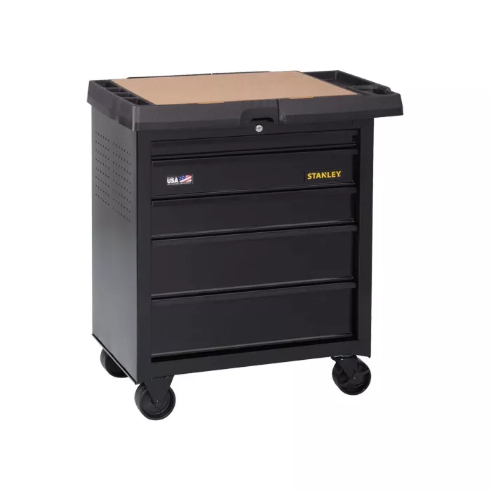- Molded top includes a power tool holster and compartments to organize small parts around and under the work surface