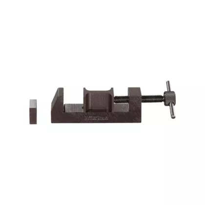 - These clamps are useful in layout work or for holding work securely in drilling and other similar operations. Each clamp is furnished with two take-up blocks that slip on the end of the screw. The blocks are held to allow a slight swivel action which conforms the angle of the block to the shape of the work being held. There is a hole in the base of the clamps so that they may be fastened to the bench and used as a small vise. Clamps are made of case-hardened steel and are smoothly finished.