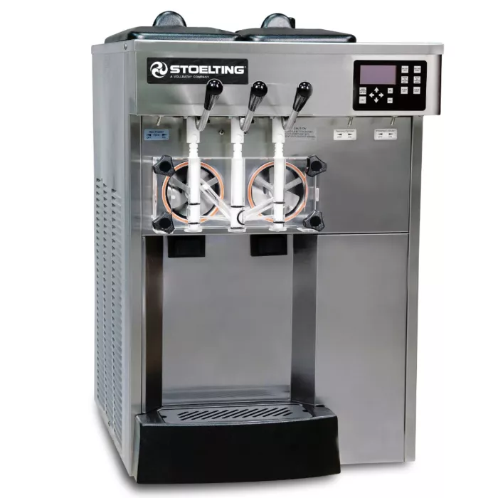 Give your cones a tasty twist with the Stoelting twin-twist soft serve countertop machine. This 208-240-volt, 8,600-BTU, single-phase, air-cooled model allows you to serve two single soft serve flavors or combine them for a twist. Delivering high-quality consistency from first cone to last, this hardworking yet compact countertop unit easily handles peak demands and is built to last. Cleanup and maintenance are a breeze; the Intellitec2® control provides the ultimate in worry-free operation, and the Energy Conservation Mode (ECM) protects against over agitation. The optional floor stand creates a floor model package, freeing up counter space and providing additional storage.