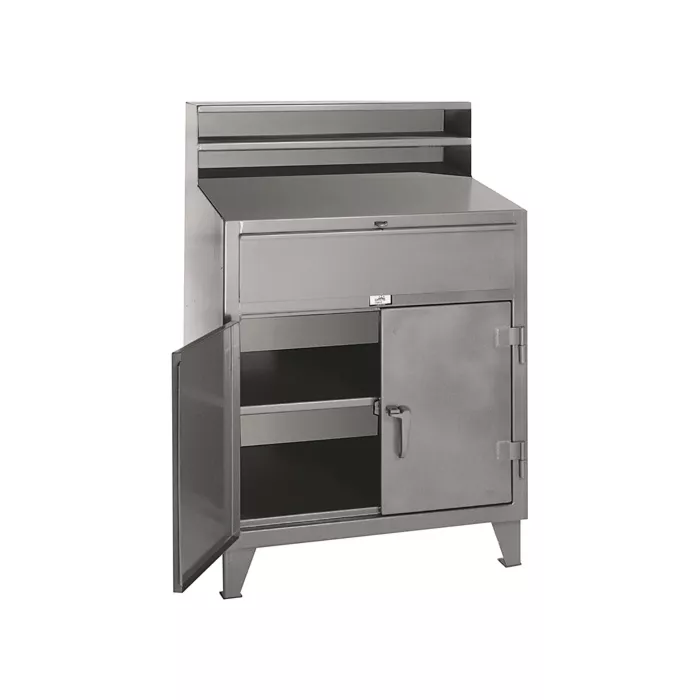 - Heavy-duty shop desk, with a 29" W x 20" D and 6" H drawer. Includes a lockable hasp separate from the 3-point locking system in the cabinet doors.