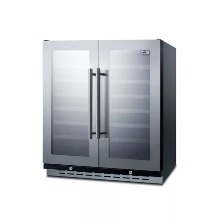 30" wide built-in undercounter dual zone wine and beverage cooler; two french doors, digital controls, glass doors, and LED lighting.