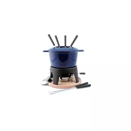 This enameled cast iron fondue pot is designed for versatility, suitable for cheese, meat, and chocolate fondues. It can rest on a rechaud/stand or be used directly on the stovetop, making it ideal for various serving scenarios. With a stylish deep blue color, it combines function and aesthetic appeal.