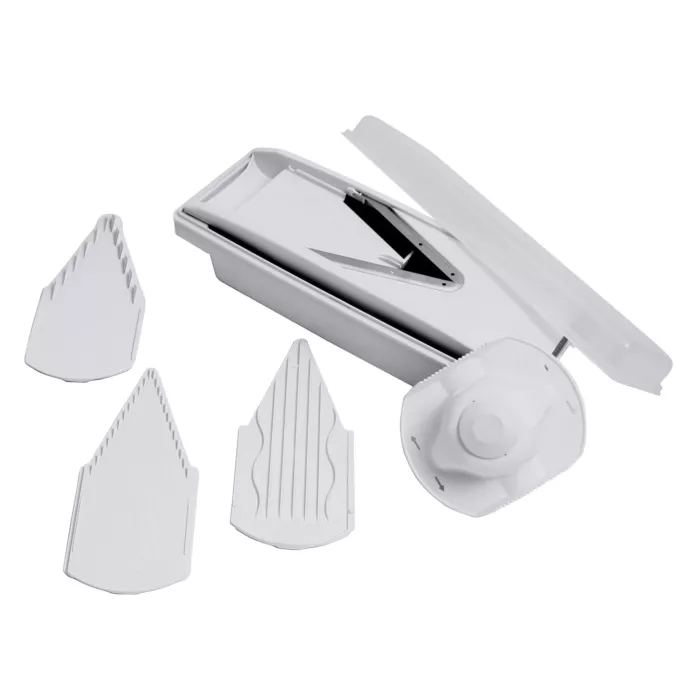 - Includes: Mandoline Slicer, Multi-function bowl with lid, 1 thick/thin slicing insert, 2 blade inserts (7 & 3.5 mm), Safety holder, easy to use instruction manual.