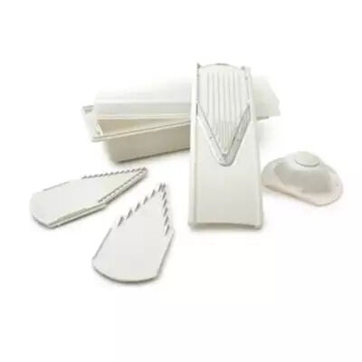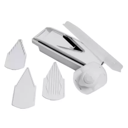 This German made mandoline set features surgical grade stainless steel blades designed for precise slicing. It includes multiple blade inserts for julienne, shred, and slicing options, accommodating different food preparation needs. The set meets food safety standards and includes a safety holder for secure handling.