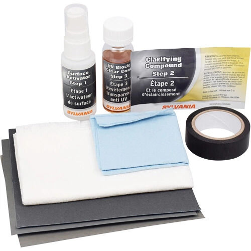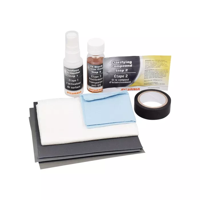 - Includes: (1) 1 oz. Bottle of surface activator, (1) 1 oz. Bottle of UV block clear coat, (1) Clarifying compound, (1) Applicator, (2) Polish cloths, (1) Vinyl glove, (3) Sandpaper pads (400, 1000 & 2000 grit)