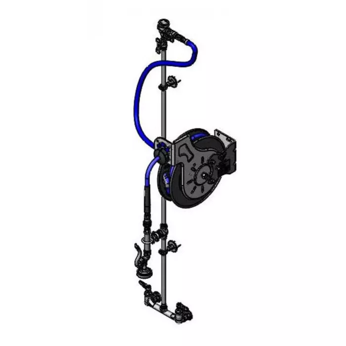 8" wall mount mixing faucet with polished chrome plated brass body, compression cartridges with spring checks, lever handles, 1/2" NPT female inlets, 16" riser, control valve, 40" riser, wall brackets, continuous pressure vacuum breaker, 36" flexible water hose connector with stainless steel quick disconnect, open coated hose reel with 3/8" x 35' heavy-duty non-marking hose, ratcheting system, 1.42 GPM spray valve with quick disconnect and extended wand spray valve with quick disconnect, multi-fit bracket and adjustable hose bumper. Certified to ASSE 1056.