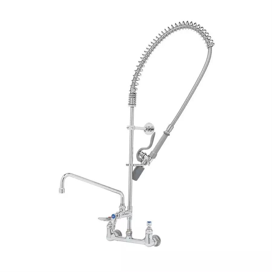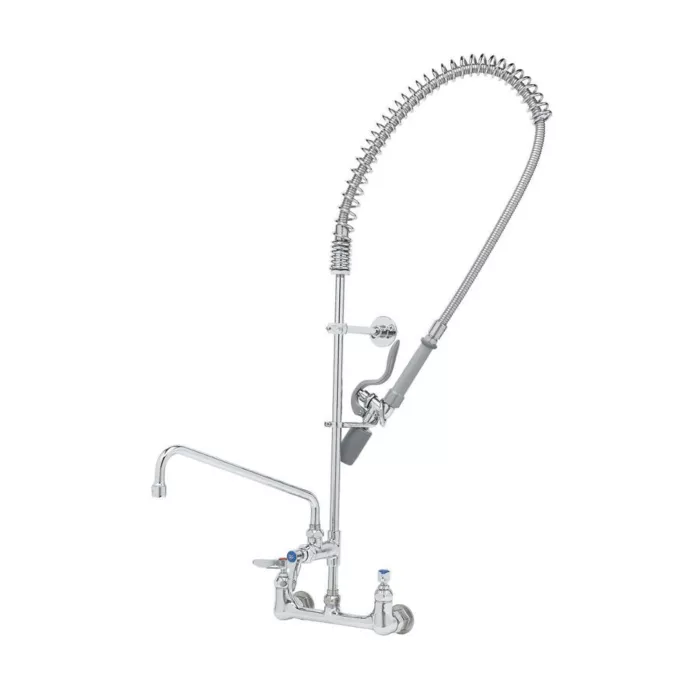 8" wall mount mixing faucet with polished chrome plated brass body, add-on faucet with ceramic cartridge and lever handle, 12" swing nozzle with stream regulator outlet, 18" riser, 44" flexible stainless steel hose with heat resistant handle, 0.65 GPM low flow spray valve, ceramic cartridges with check valves, lever handles, 1/2" NPT female inlets, 6" adjustable wall bracket, spray valve holder and overhead spring. Certified to ASME A112.18.1/CSA B125.1, NSF 61-Section 9 and NSF 372. EPAct 2005 compliant.