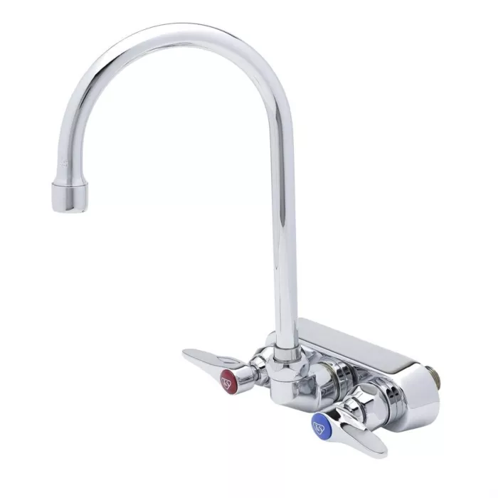 4" wall mount mixing faucet with chrome plated brass body, 5 3/4" swivel gooseneck with 2.2 GPM aerator, compression cartridges with spring checks, lever handles, 1/2" NPT male inlets and chrome plated escutcheon. Certified to ASME A112.18.1/CSA B125.1, NSF 61-Section 9 and NSF 372. Meets ADA ANSI/ICC A117.1 requirements.