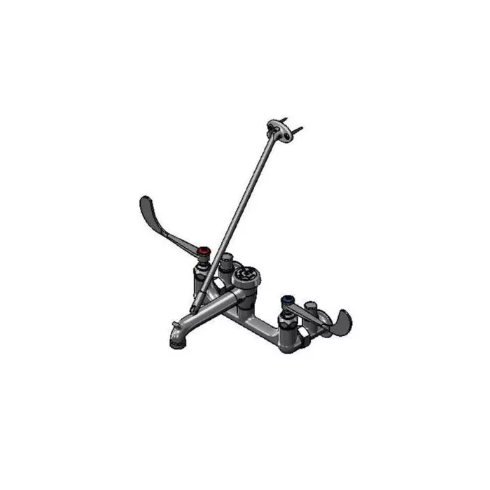 8" wall mount mixing faucet with polished chrome plated brass body, polished chrome plated brass spout with vacuum breaker, pail hook and garden hose male outlet, compression cartridges with spring checks, 6" wrist action handles, 1/2" NPT female inlets, loose key stops, and upper support rod. 8.90 GPM @ 60 psi.