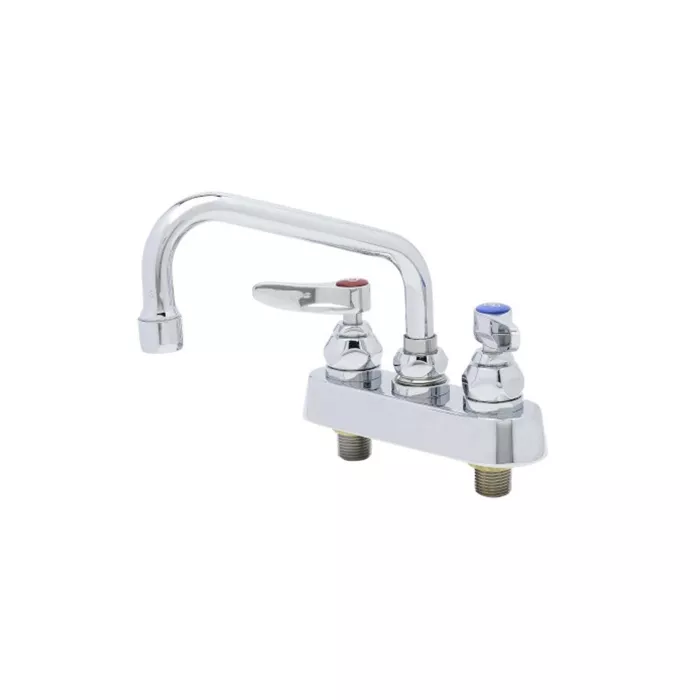 4" deck mount mixing faucet with chrome plated brass body, 6" swing nozzle with 2.2 GPM aerator, compression cartridges with spring checks, lever handles, 1/2" NPT male inlets and chrome plated escutcheon. Certified to ASME A112.18.1/CSA B125.1, NSF 61-Section 9 and NSF 372. Meets ADA ANSI/ICC A117.1 requirements.
