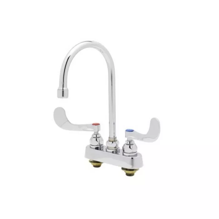 4" Deck mount mixing faucet with chrome plated brass body, 5.75" swivel gooseneck with 2.2 GPM aerator, compression cartridges with spring checks, wrist action handles, 0.5" NPT male inlets and chrome plated escutcheon. Certified to ASME A112.18.1/CSA B125.1, NSF 61-Section 9 and NSF 372. Meets ADA ANSI/ICC A117.1 requirements.