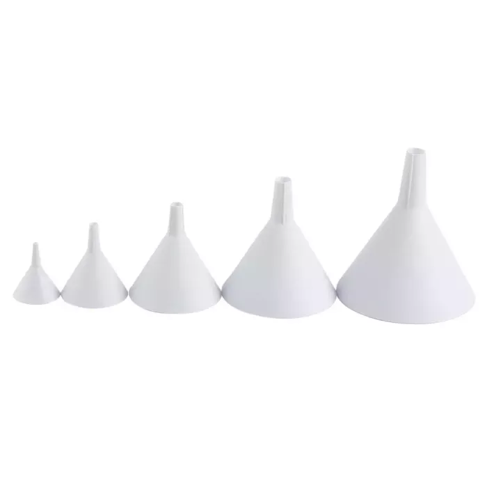 This white plastic funnel set is a necessity for any kitchen or restaurant! Coming with 5 different funnels with diameters ranging from 2" to 6", this set is ideal for making funnel cakes or transferring oils or sauces from one container to another. You can even use it to funnel dry ingredients without spillage or messes.