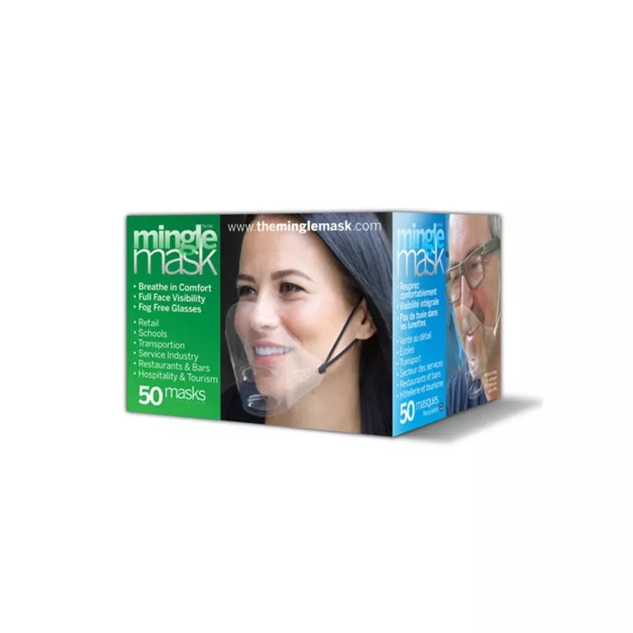 Mingle Mask is an invisible, ergonomic mask that shows your face yet still provides the benefits of mask protection. You can breathe easy - because it doesn’t fog up. One size fits everyone. It fits comfortably around your ears and has a built-in chin rest.