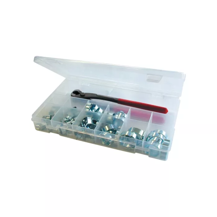 - An 80-piece assortment of 2 ear hose clamps (5/16" to 1") offered in a durable plastic box. Pincers included.; ; Kit Contains; 10 x 5/16" (TA561) ; 10 x 5/8" (TA567); 10 x 3/4" (TA568) ; 10 x 1/2" (TA564) ; 10 x 7/8" (TA570) ; 10 x 9/16" (TA565) ; 10 x 1" (TA572)