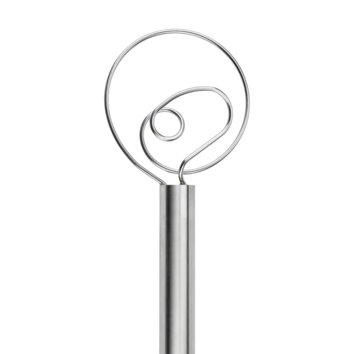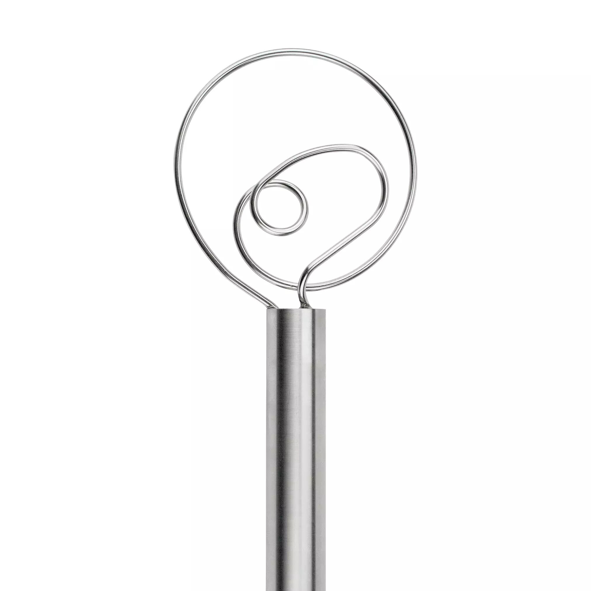Whip up a moist cake or flawless pasta dough with Tovolo's Dough Whisk! This whisk is crafted with stainless steel for durability and simple cleaning. The winding wires blend wet and dry ingredients thoroughly. Tovolo's Stainless Steel Dough Whisk is perfect for small desserts or large family meals! Tovolo Stainless Steel Dough Whisk (81-6768) Features: Flow-through wire whisk blends thoroughly & gently Thick wires cut through dough easily Durable stainless steel handle is dishwasher safe Dishwasher safe Food Safe BPA Free