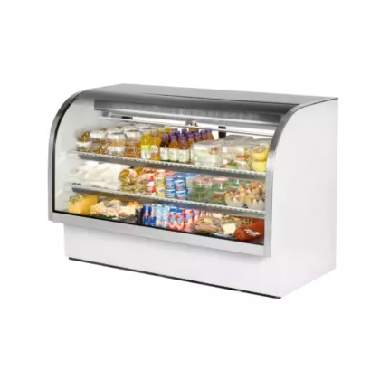 True’s curved glass deli case combines efficient, high volume merchandising and exceptional refrigeration with an elegant curved glass front for sophisticated presentation of deli products. High humidity gravity coil refrigeration system maintains 38°F to 40°F (3.3°C to 4.4°C) for the freshest display of meats, cheeses and deli products. Self-contained, environmentally friendly (CFC free) 134A refrigeration system.