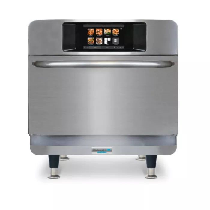 The TurboChef BULLET High-Speed Countertop Microwave / Convection Oven uses radiant heat, high-speed air impingement, and side-launched RF energy to cook food rapidly without compromising quality.