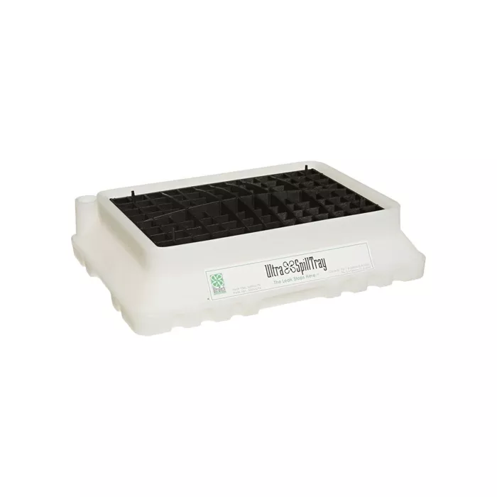 - Countertop spill containment tray safely stores bottles, beakers, and other labware