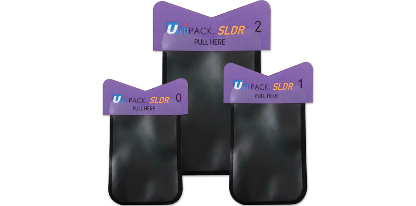 Unipack's all new SLDR PSP Phosphor Plate Barrier Envelope are designed for super easy loading and removal of phosphor plates. The transparent side helps identify plate location. Once the tab is peeled off, the envelope practically seals itself. Center notch-cut allows for easy tear and plate removal. These envelopesare soft, with pliable vinyl rounded corners for greater patient comfort.