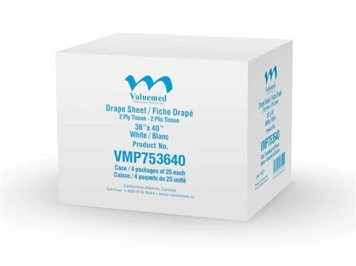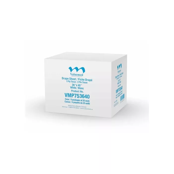 Valuemed's exam drape sheets are made from two layers of tissue bonded together and embossed for comfort. Ideal for professional exams and procedures. Size: 36" x 40" Colour: White 100 sheets/case| Made in Canada | Yes |