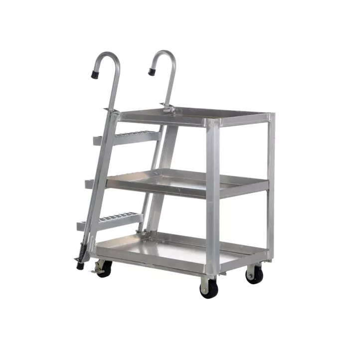 - Convenient spring loaded steel step ladder holds the cart securely in place while a person is standing on the ladder