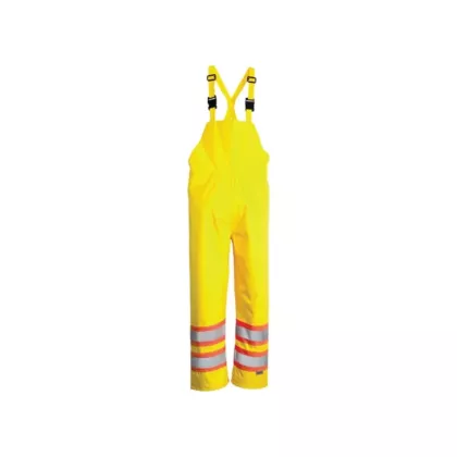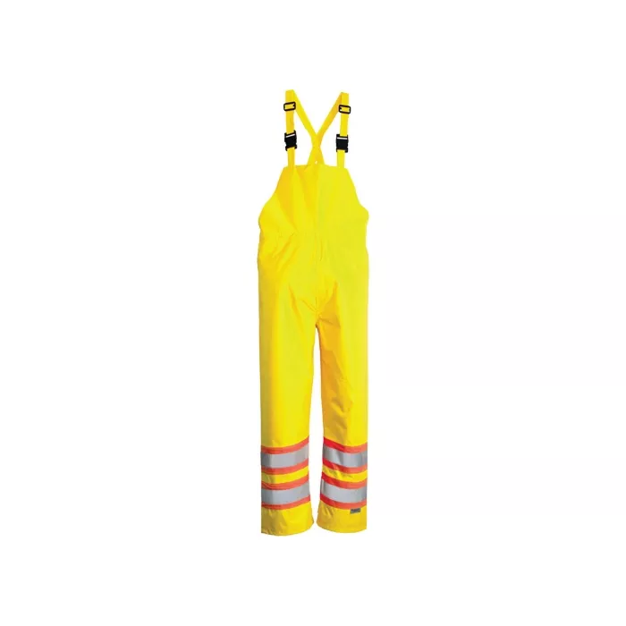 - Attached bib pants with elasticized waist, hook & loop fly access, elastic suspenders with quick release buckle, and adjustable boot cuffs