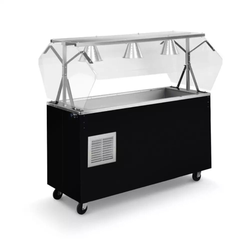 The 2-Series refrigerated cold-food station by Vollrath adds convenience and versatility to your buffet, cafeteria or another serving area. The seamless stainless steel work surface is durable and long-lasting, and the scratch-resistant vinyl-clad carbon steel exterior resists signs of wear to maintain its like-new appearance. Each well features polyurethane foam insulation and is refrigerated with R513A, a nonflammable low Global Warming Potential (GWP) refrigerant, making it easy to maintain cold serving temperatures. The buffet-style acrylic breath guards offer superior protection against contaminants while still ensuring easy access to food items. The black base creates a sleek appearance and features a storage compartment with doors that keep everything safe and secure.