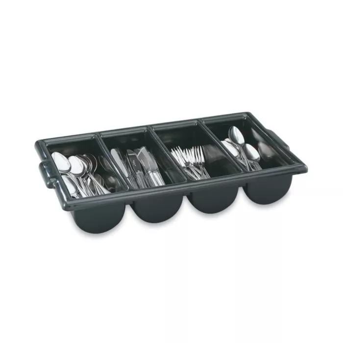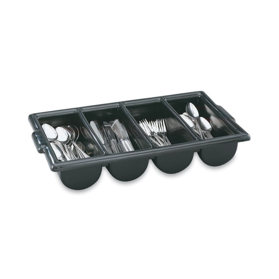 The Vollrath® cutlery box features four rounded compartments for organizing and storing your cutlery or flatware. The durable polyethylene material provides years of reliable service and built-in handles ensure easy transportation. You can also use this box for condiments or straw storage, making this an excellent, versatile option for your kitchen.