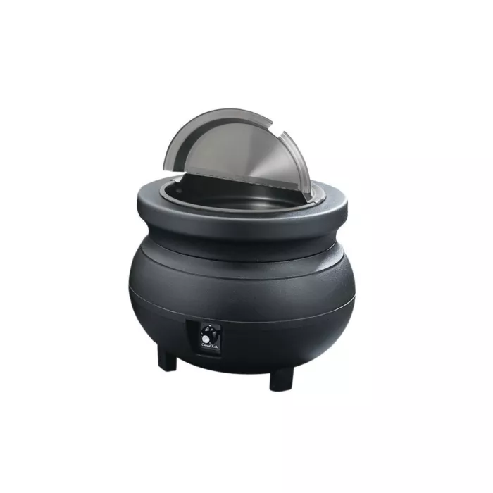 The Vollrath® 7-quart Cayenne Colonial Kettle warmer is ideal for soup, stew, chili and more. This 700-watt warmer is made of durable cast aluminum and coated in black epoxy to give it a versatile, attractive appearance. The recessed controls prevent accidental temperature adjustments, and the hinged lid seals heat inside while simultaneously allowing easy access. This kettle comes with display cards and clips to properly advertise its contents.