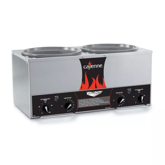 The Vollrath® Cayenne model TW-27R rethermalizer is durable, energy-efficient, and easy to use. With the direct-contact heating system, this rethermalizer uses up to 25 percent less energy and quickly heats your food. Each well has an independent thermostatic control, allowing you to heat two different products at once, as well as a rethermalizing timer that stops warming when the timer ends. Once the timer is done, simply set your desired holding temperature to maintain heat. Knob guards prevent accidental adjustments, and the durable stainless steel exterior gives this unit a clean look.