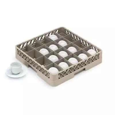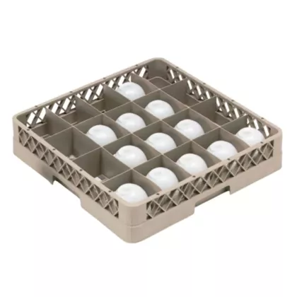 Molded in tilt bar prevents water from pooling, leaving spot free glassware. 3" high compartment dividers for vertical protection. Outside dimensions: 19 3/4" x 19 3/4" (50 x 50 cm).