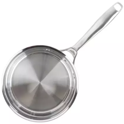 - Permanently bonded, 1/4" (6.6 mm) thick bottom layer made of aluminum and stainless steel for even heating and exceptional durability